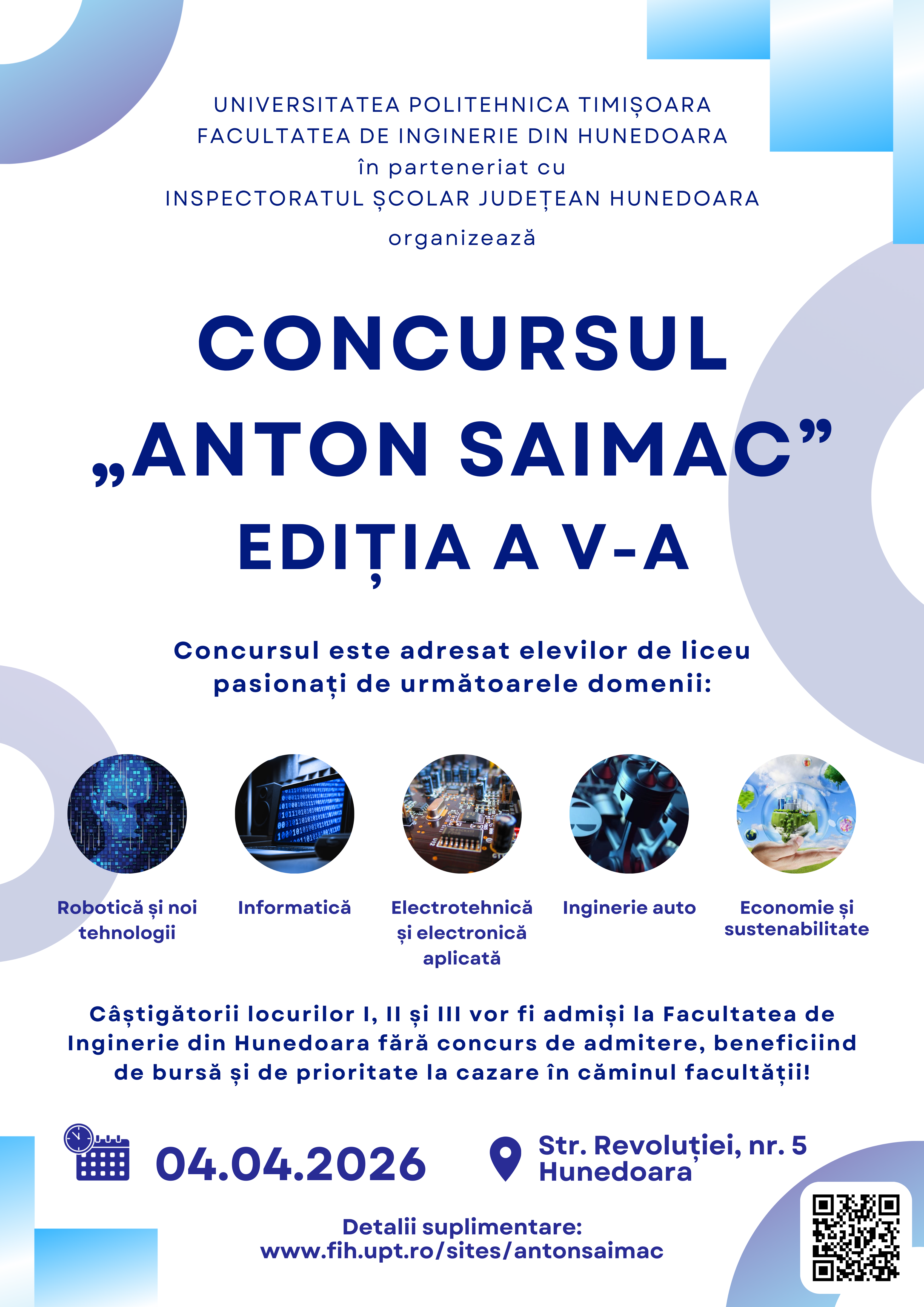 Universitatea Politehnica Timișoara - Facultatea de Inginerie din Hunedoara, organizează în campusul Facultății de Inginerie din Hunedoara, cea de a V-a ediție a concursului ”Anton Saimac”, manifestare dedicată dezvoltării gândirii creative a elevilor în domeniile tehnico-științific și digital.